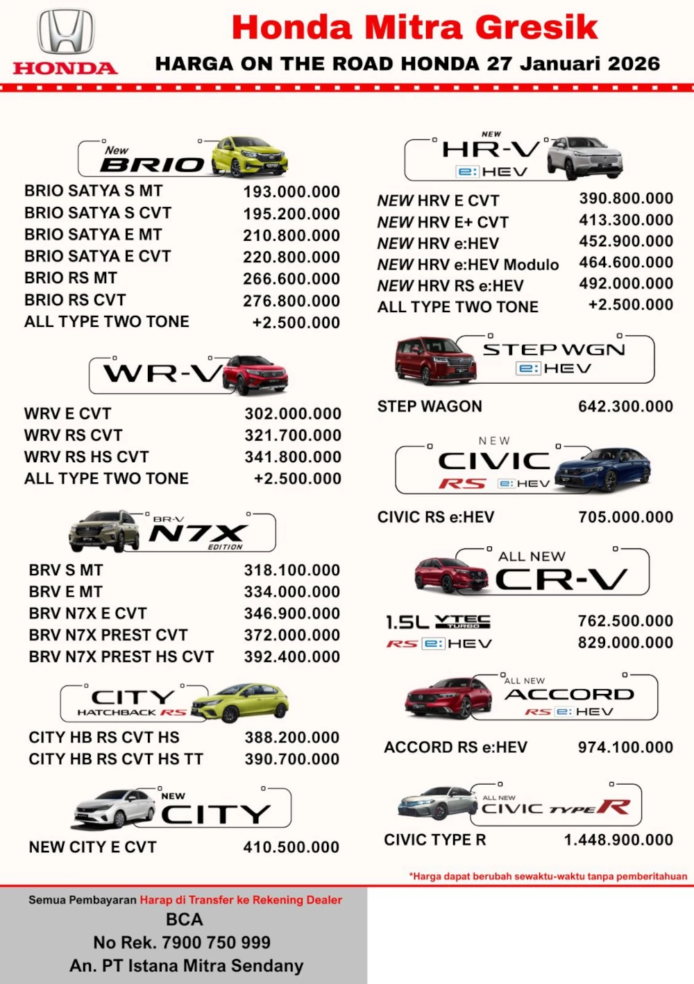Harga Mobil Honda 2026Berikut ini daftar harga OTR Januari 2026 mobil Honda wilayah Lamongan dan sekitarnya